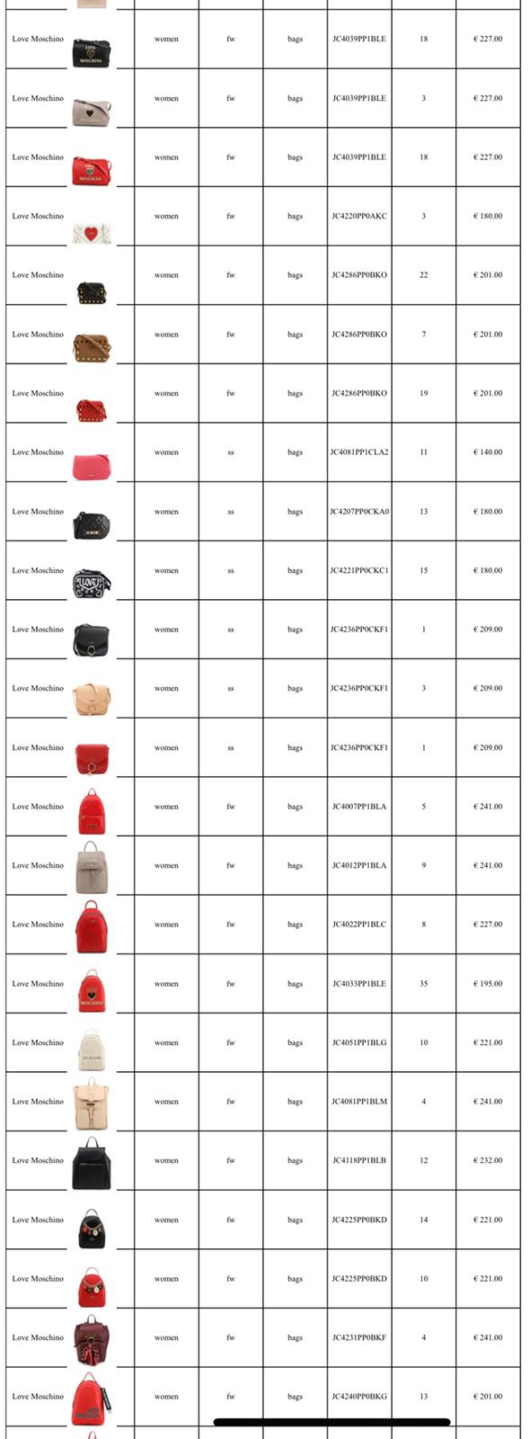 Moschino BagsSeason: 2020Quantity: 671 unitsDocuments: Sanitised InvoiceCIF price: 110 EUR pcs.Stock in Italy