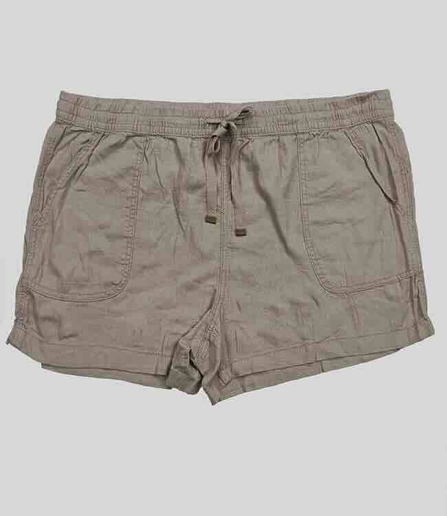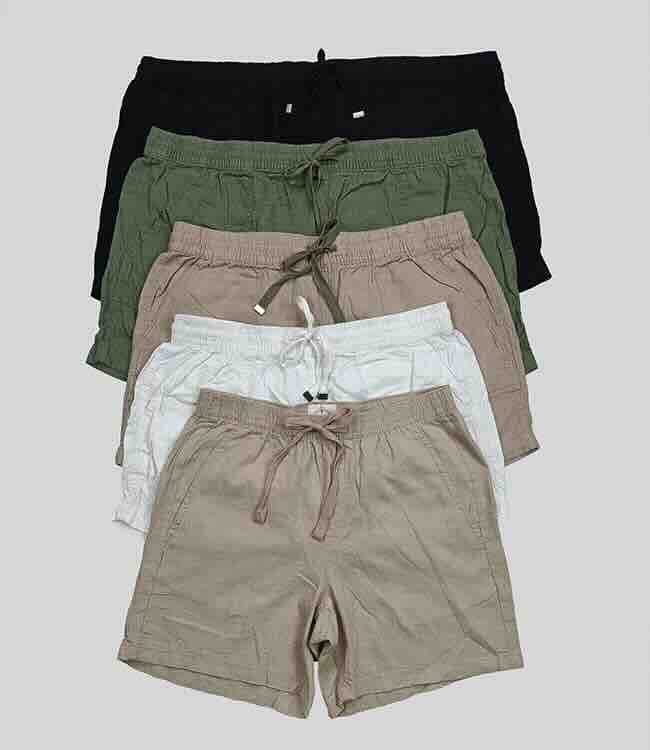 Style Description: Ladies Linen Woven Shorts. Elastic Waist With Functional Draw String. Two Front and Back Pockets.