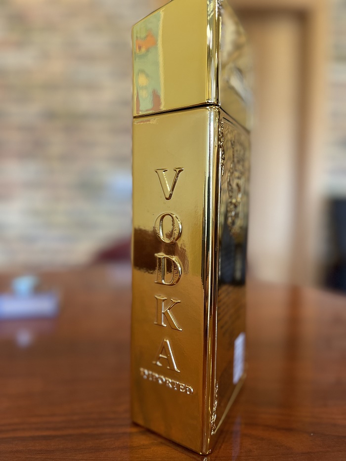 999.9 Premium Vodka is optically based on a 3-kilo gold bar.