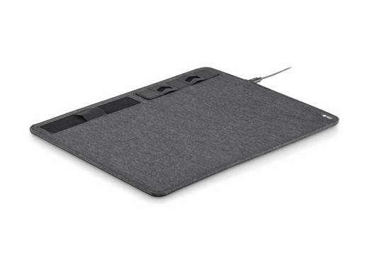 Multifunctional 2-tone mouse pad made of 300D polyester RPET with inductive charging station and smartphone holder.