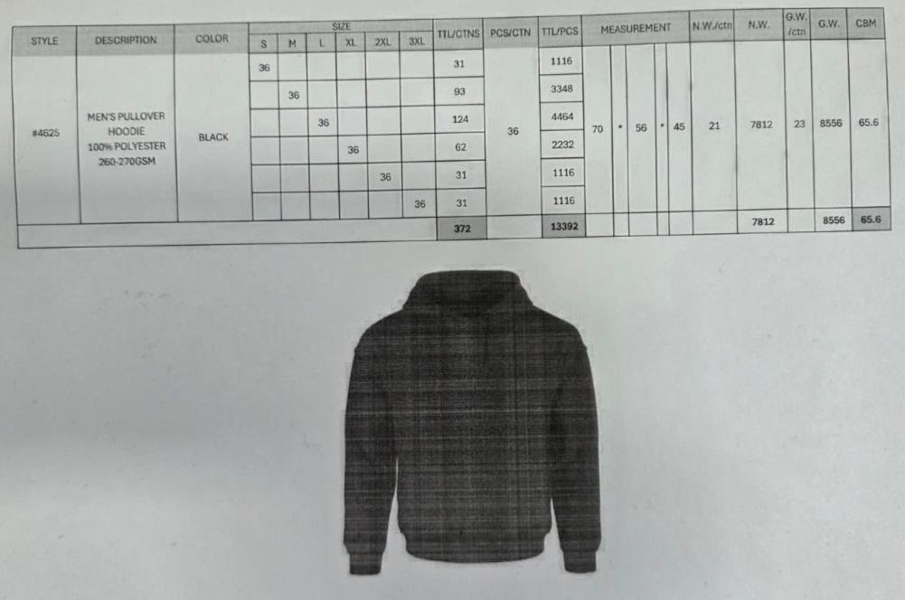 Men’s Pullover Hoodies100% PolyesterBlack onlyTotal: 13 400 piecesPrice take all: 3.99$ pcs.FOB: LA, USA